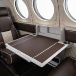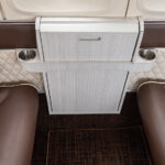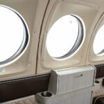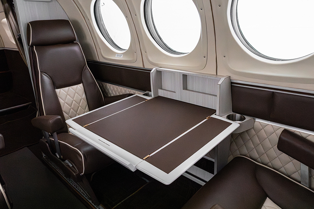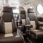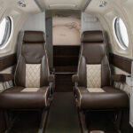 Six passenger plus belted lav. Two forward rear facing seats, middle club seating with executive writing tables, side facing aft belted lav. Forward and aft refreshment centers. Seating in brown leather with cream piping and insets. Lower sidewalls in cream leather with brown upper trim. Wooden divider panels, Skandia Thermaz acoustic kit, Steinback & Associates R134 air-conditioning system, Medco locks, dual cable Airstair door kit, USB A outlets. Interior updated 12/2023.