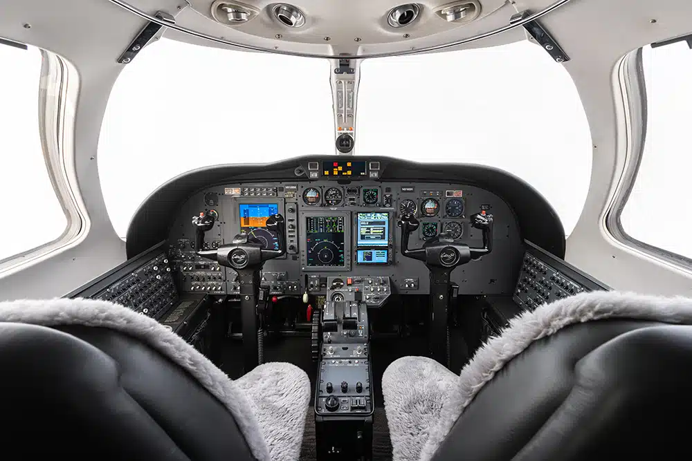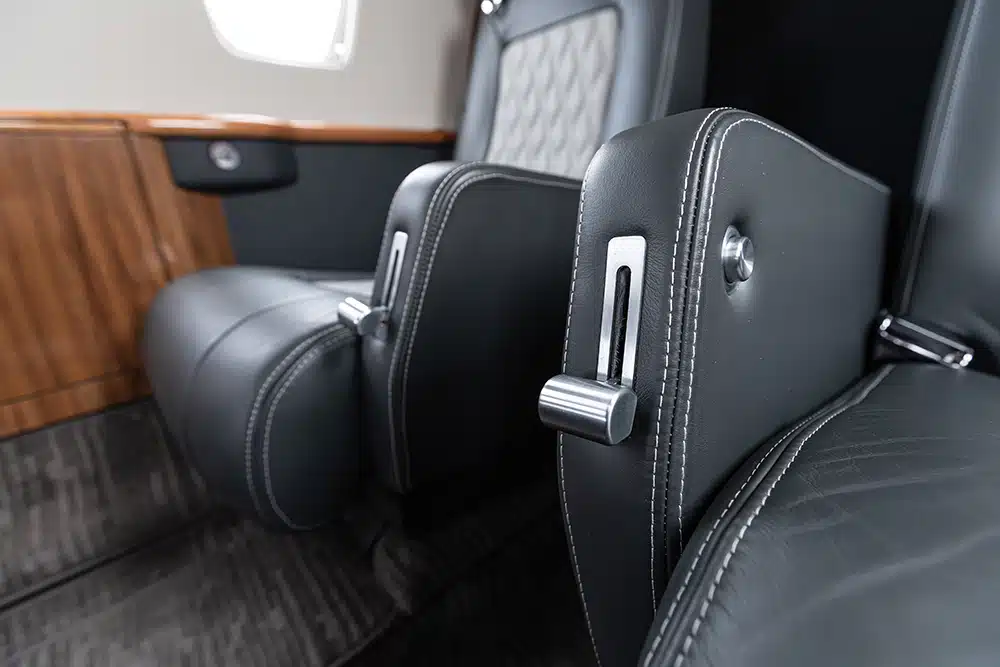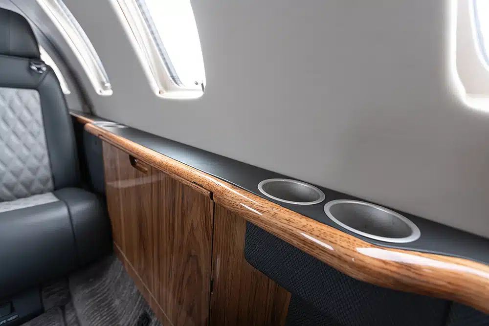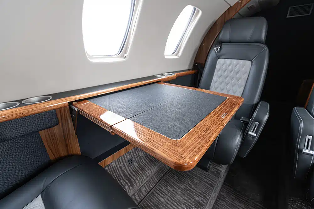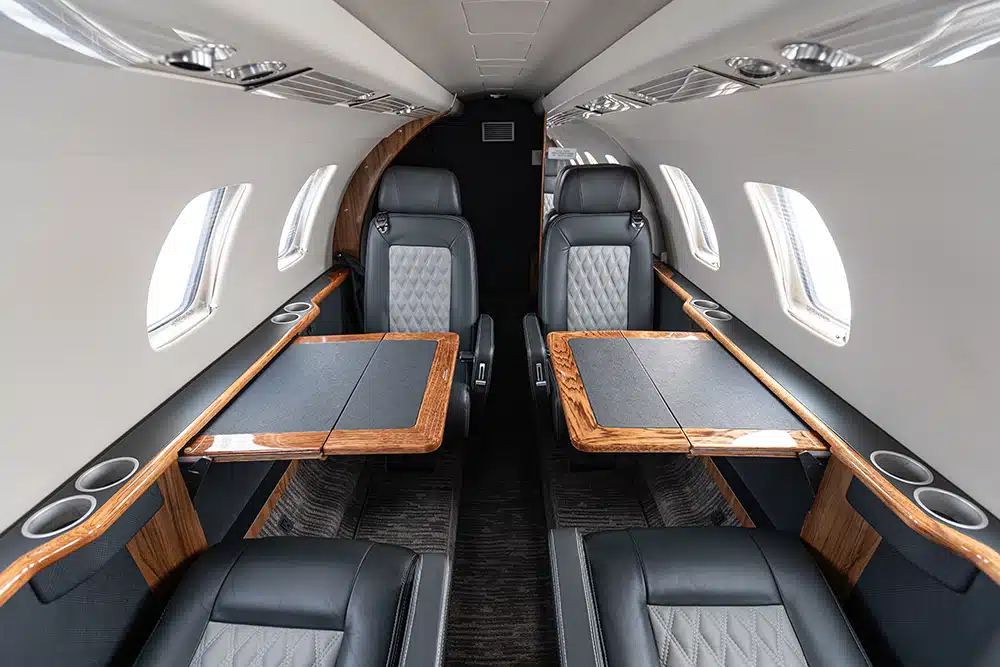 The interior was completely refreshed in 2024 with navy and light gray leather seats featuring a diamond pattern stitching. Cabin seating features a 6 (six) passenger configuration with a center club, a forward right-hand side-facing seat and aft belted lavatory. The center club features executive tables. There is a left-hand storage cabinet.