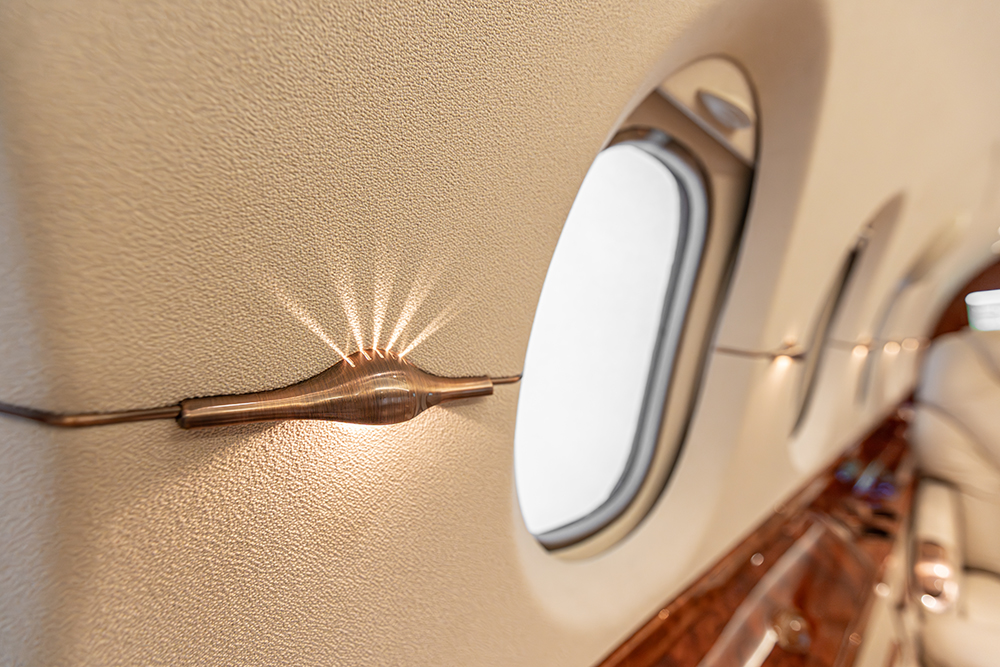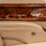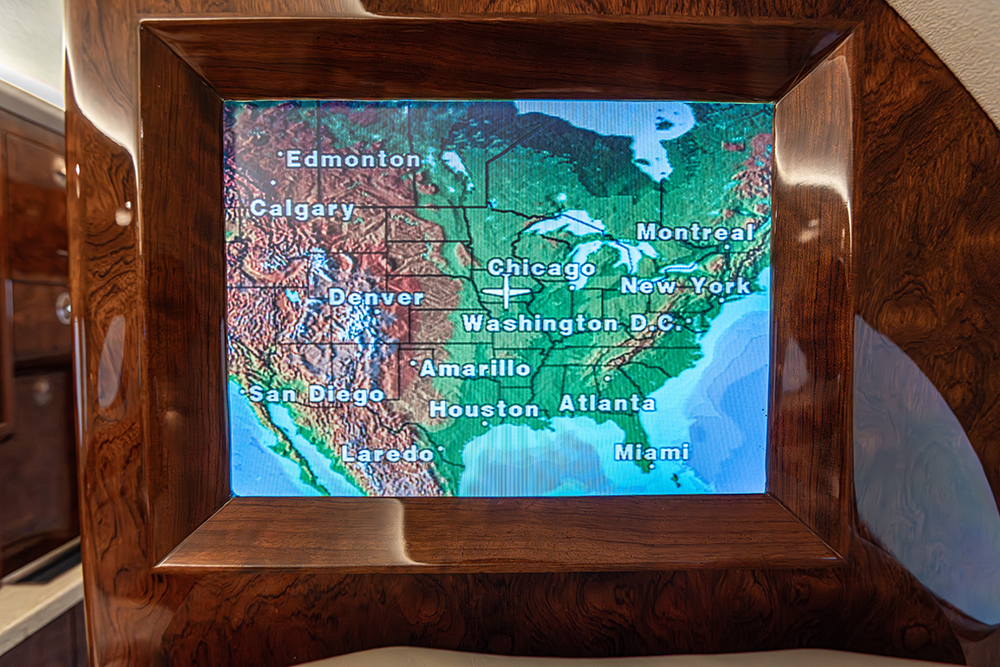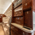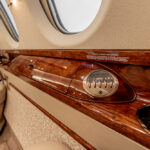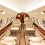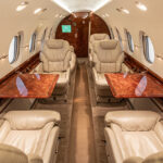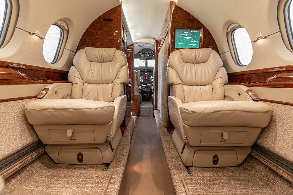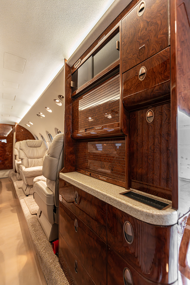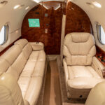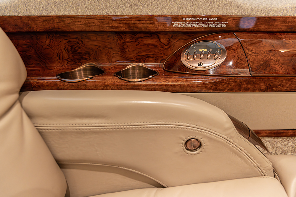 Eight passenger mid-cabin 4-place club with dual executive writing tables, aft forward-facing executive seat opposite 3-place divan. Forward refreshment center with forward RH baggage. Aft lav with washbasin and luggage closet. Belted lav. Seat leather in excellent condition. New carpet 5/2022.