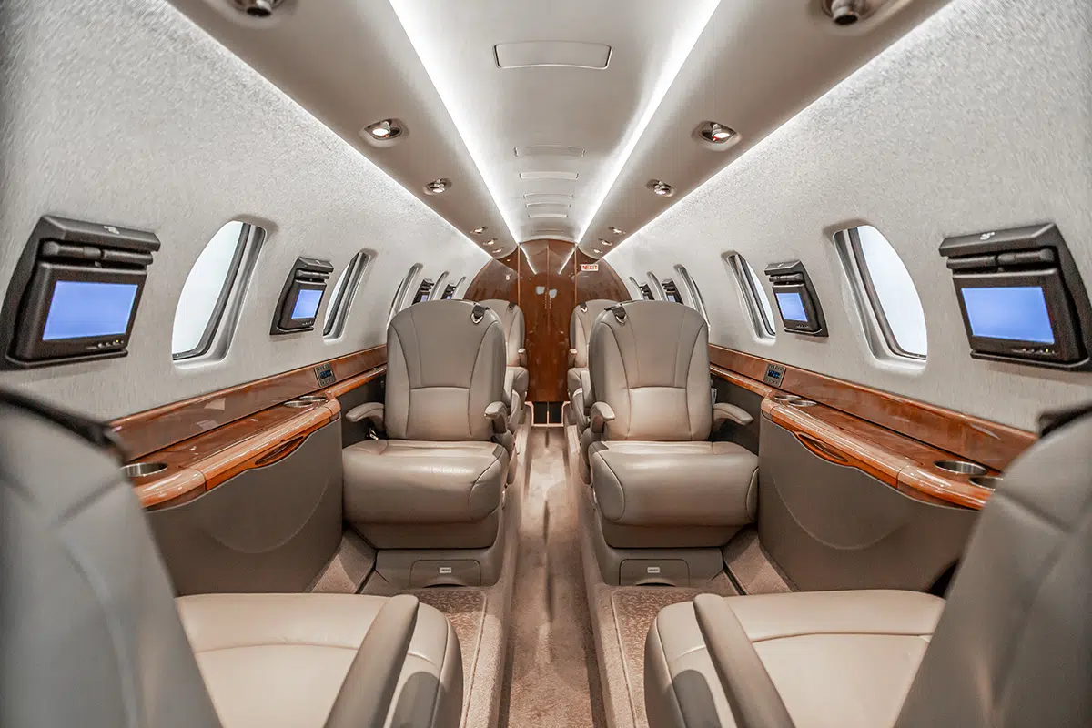 This Citation Sovereign’s cabin is configured for 10 passengers – it has double club seating and a forward, 2-place divan. In 2016, the crew and cabin seating was redone and the carpet and lower sidewall material was replaced.
