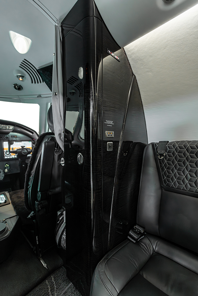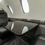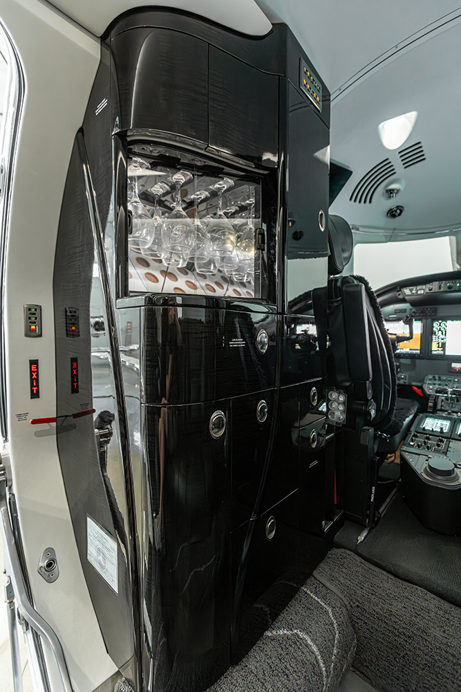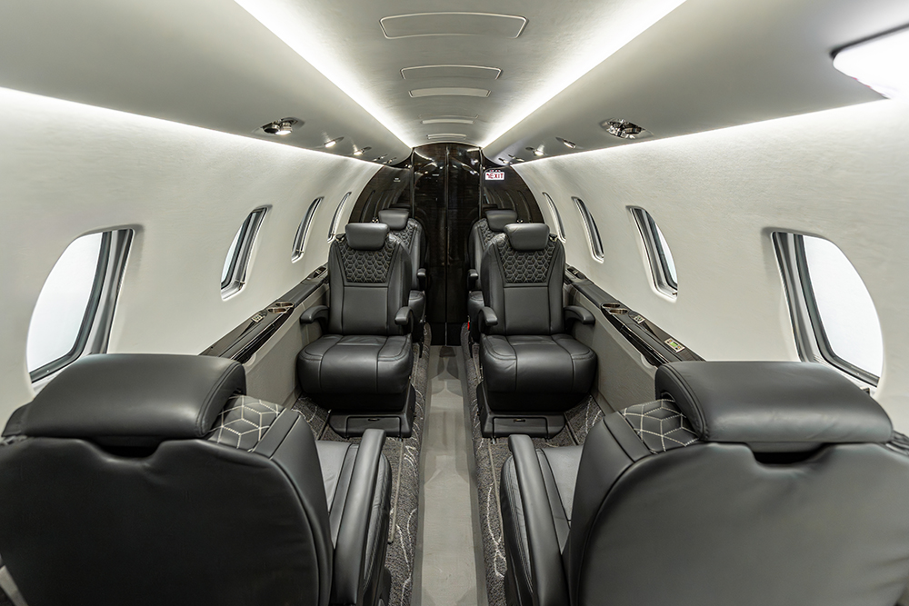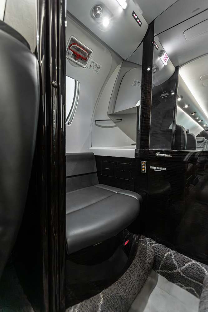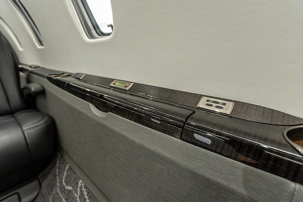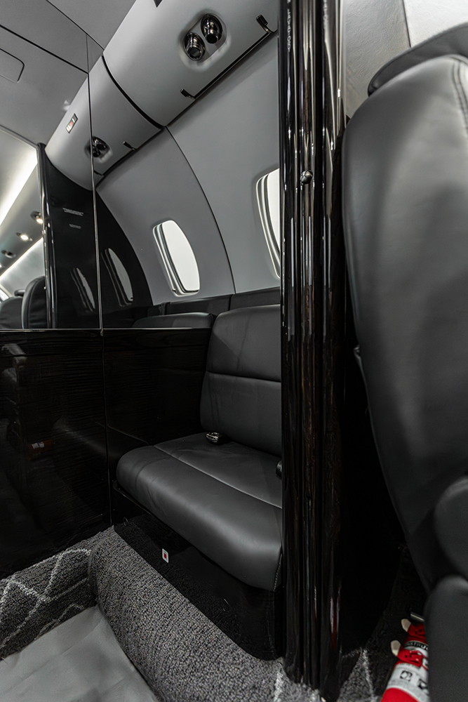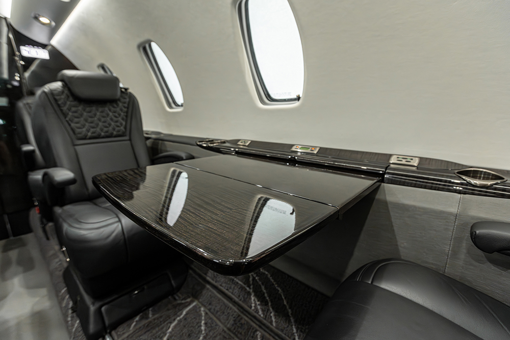 Complete refurbishment in 2024 by Elliott Aviation. 4-Place forward club seats, dual aft forward facing seats, forward side facing 2-place divan, belted lav and forward left side refreshment center. Black leather seating with dark high gloss veneer, Arctic upper sidewalls with dark gray carpet.