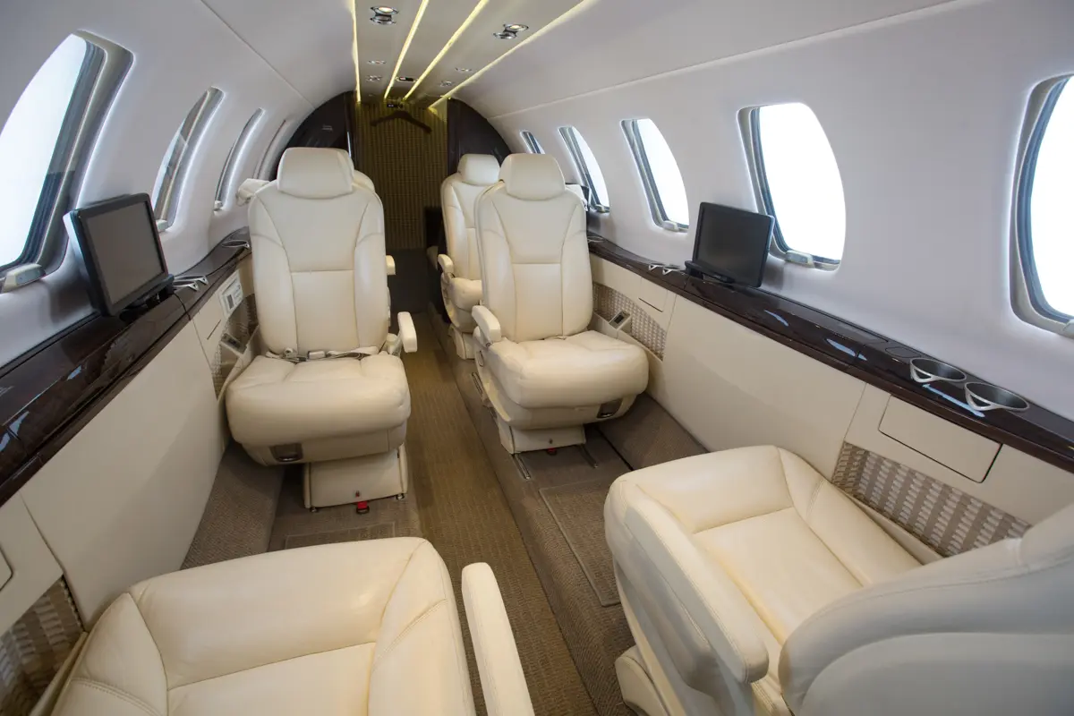 Eight passenger interior. Six cabin seats arranged in a forward club. Front R/H two-place divan, aft belted lav. Finished in French Vanilla Townsend Leather. Forward refreshment center finished in high gloss smoked eucalyptus veneer. Crystallite nickel plating, Townsend Leather French Vanilla headliner, Alabaster Cream sidewalls, Scott Group underline carpet.