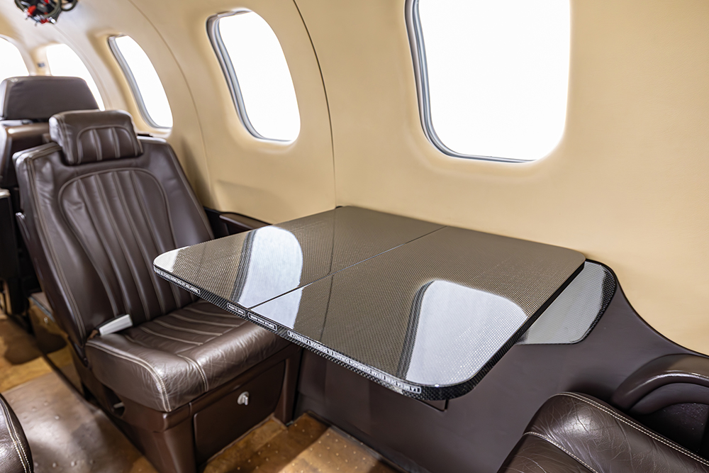Brown and tan interior featuring six genuine leather seats with adjustable backrests and folding arm rests. Leather upper cabin side panels, leather covered lower cabin side panels, wool carpeting. Individual fresh-air vents and reading lights. Baggage compartment with straps and baggage net.