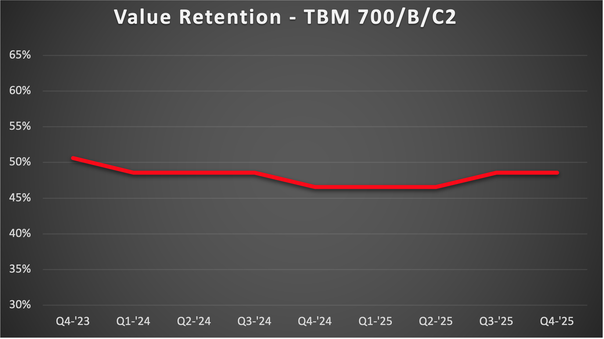TBM 850 inventory has declined, and transactions have picked up. There are 23 listings in this market, which is down from 26 three months ago. 7.2% of the active fleet is listed, which is similar to a year ago. Activity has picked up, with Q4 producing 11 sales, well above the six that traded during the fourth quarter of 2024. Values have held steady for six months now, after a small increase halfway through the year. As usual with these TBM markets, stable pricing and supply are resulting in a consistent, balanced market for buyers and sellers.