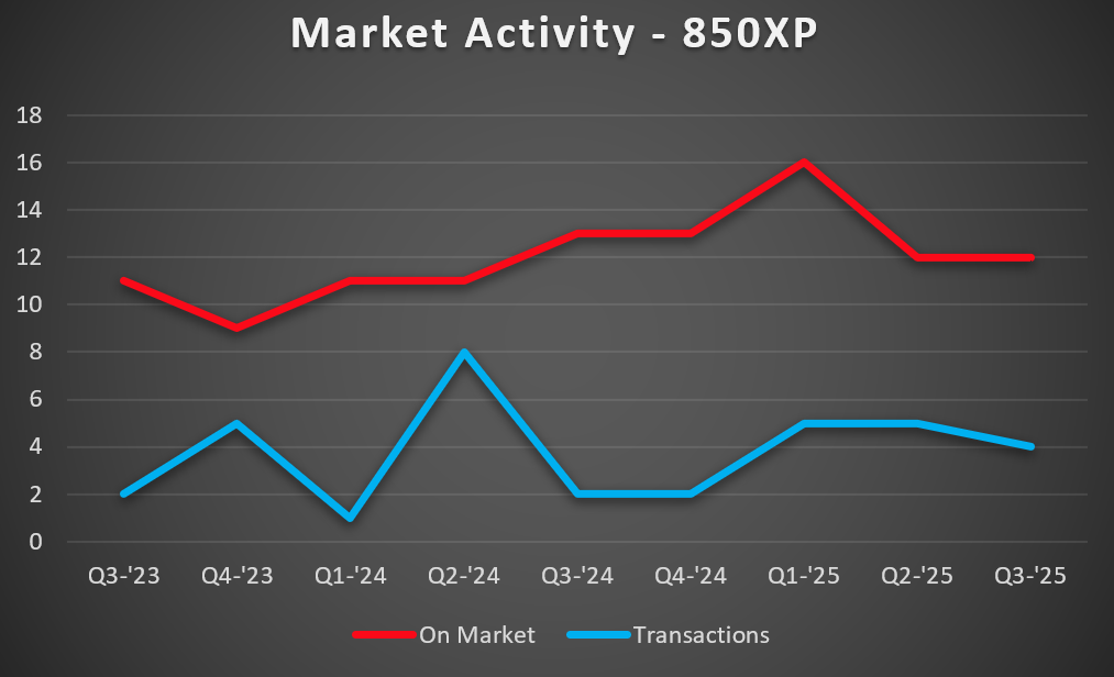 Hawker 850XP inventory, demand, and pricing are all holding steady. There are 12 listings in this market, similar to last quarter, and down four units from Q1. With the first quarter of 2025 being the outlier with elevated inventory, the number of listings in this market has been relatively stable, going back all the way to Q1 of 2024. Demand remains consistent, with four sales taking place during Q3. This makes 14 total transactions on the year, ahead of 2024’s pace of 11 sales by this time. Pricing is holding steady, as this market seems to have found its footing a little closer to 900XP values than in previous years. With steady inventory and pricing, this market remains balanced for buyers and sellers.