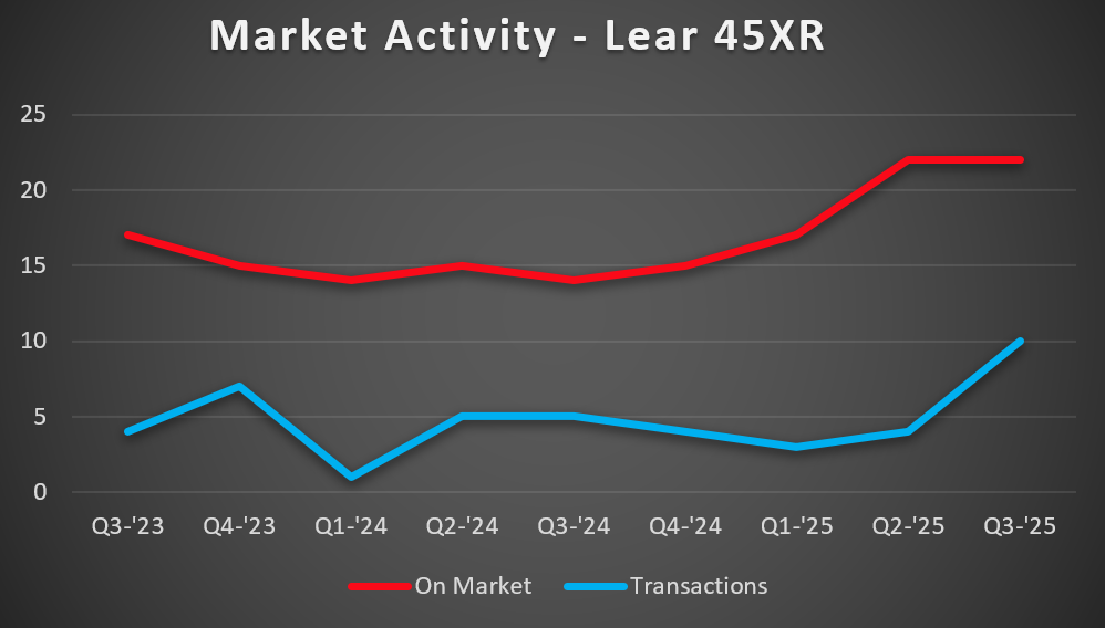 Lear 45XR inventory is holding steady, and transactions are picking up as we move into the fourth quarter of 2025. There are 22 listings in this market, unchanged from the prior quarter. The first six months of the year only produced seven sales, but Q3 was busy with 10 transactions taking place. This is the most active quarter we’ve seen in this market going back many years. Pricing has held steady, with late-model, high-quality airplanes commanding a premium. With steady inventory and strong demand, this market is considered balanced for buyers and sellers.