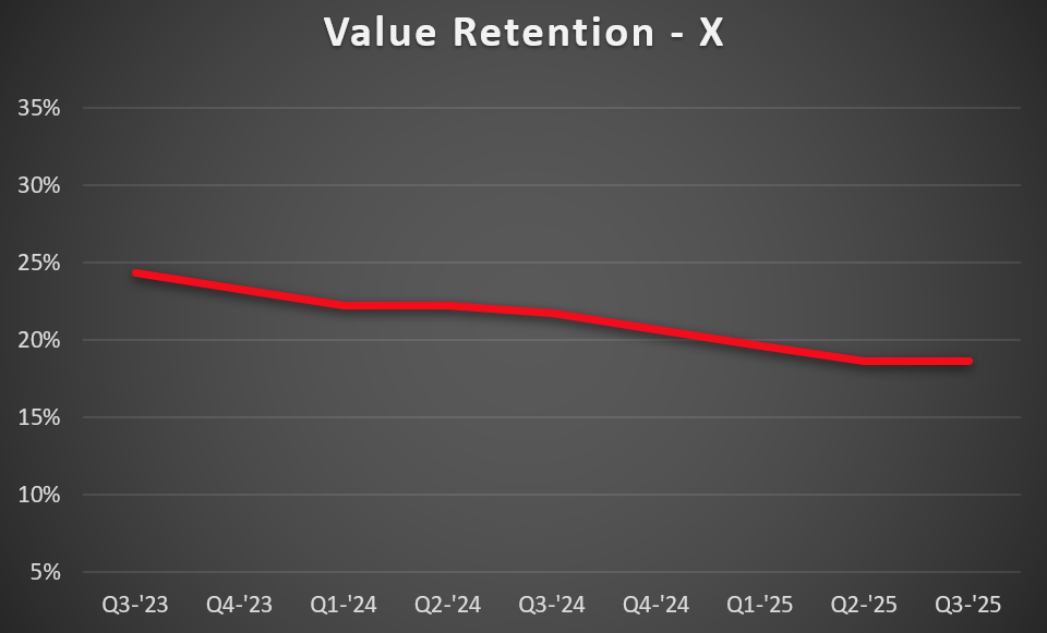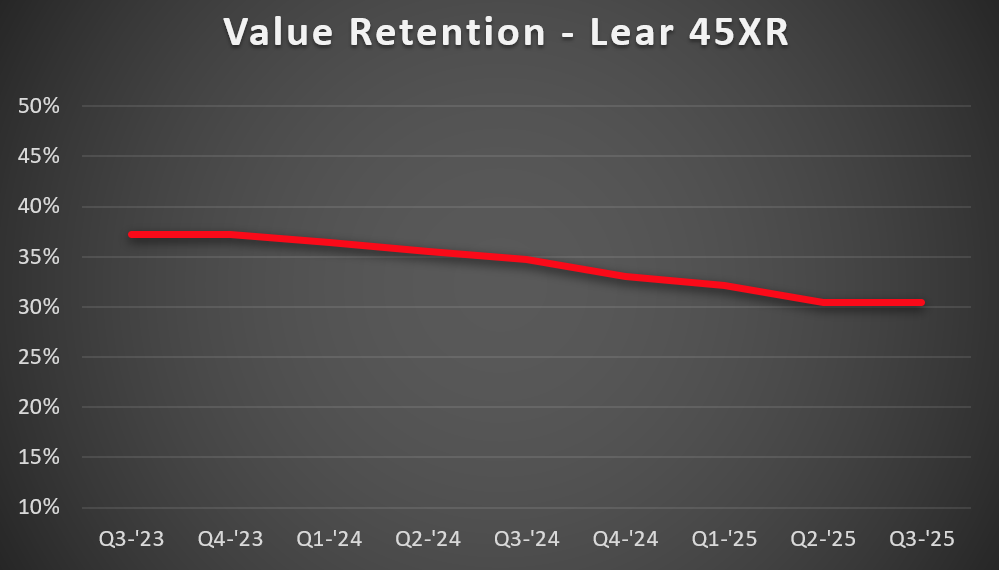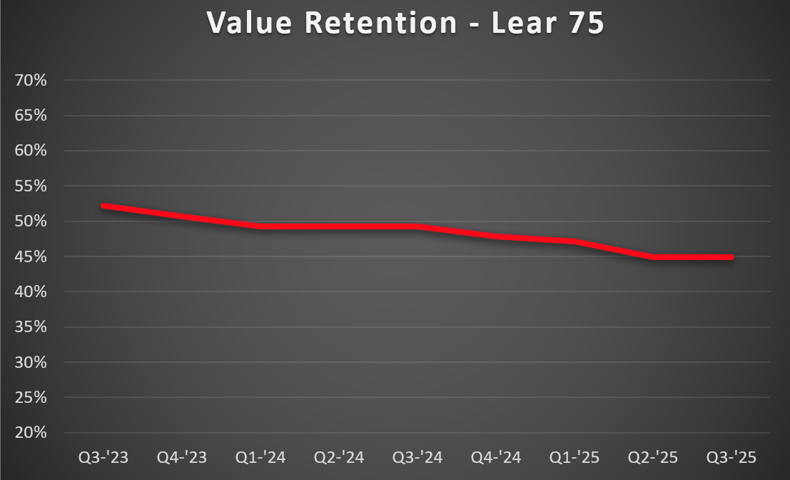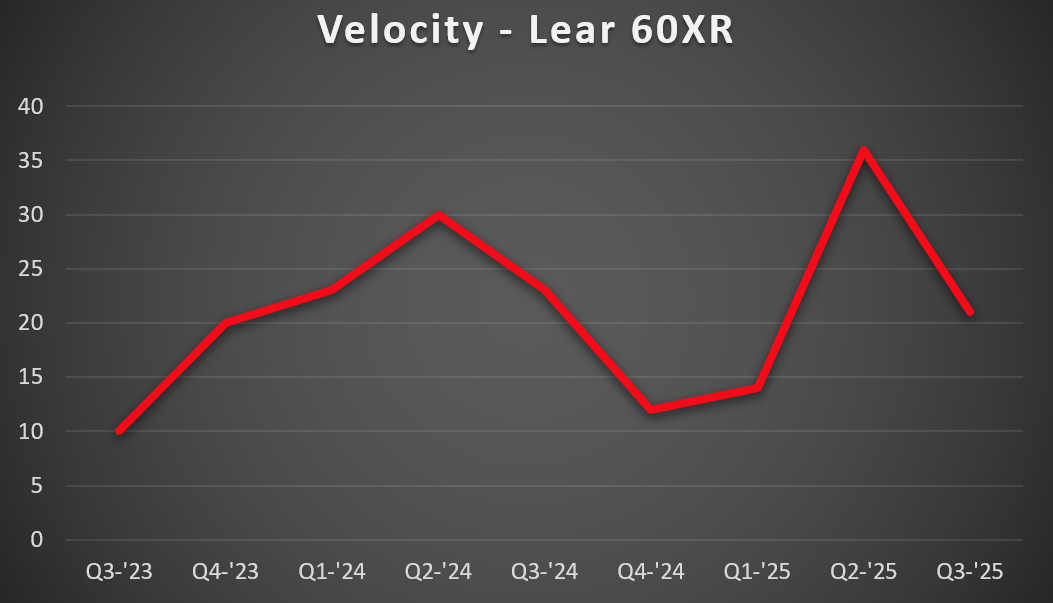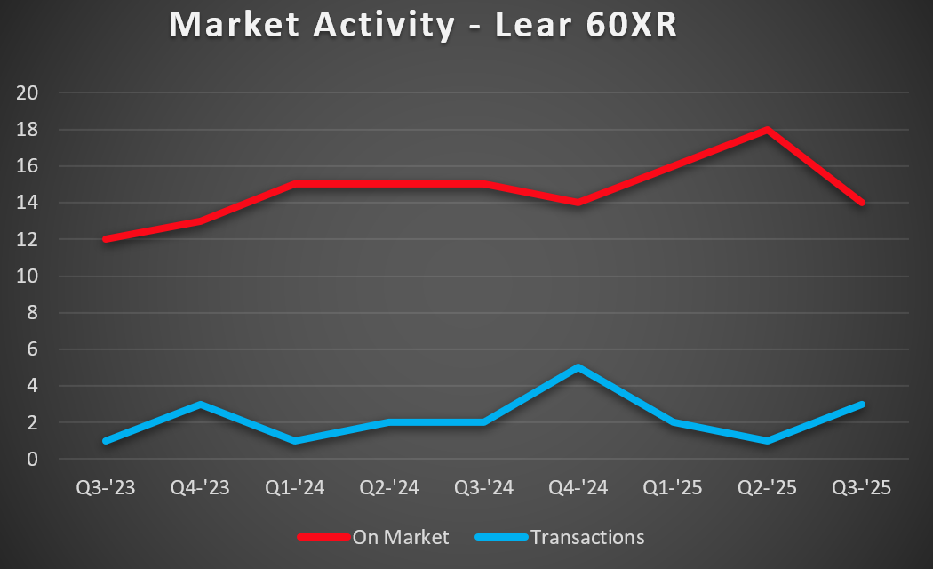 Lear 60XR inventory has dropped back down to 2024 levels, and activity remains steady. There are now 14 aircraft for sale, down from 18 listings during Q2. Currently, 12.5% of the active fleet is for sale, equal to Q4 of 2024 levels. Three sales took place during Q3, matching Q1 and Q2’s combined transactions. Pricing has softened, with values dropping roughly $200k across all model years. With attractive pricing and ample inventory, this market remains favorable for buyers.