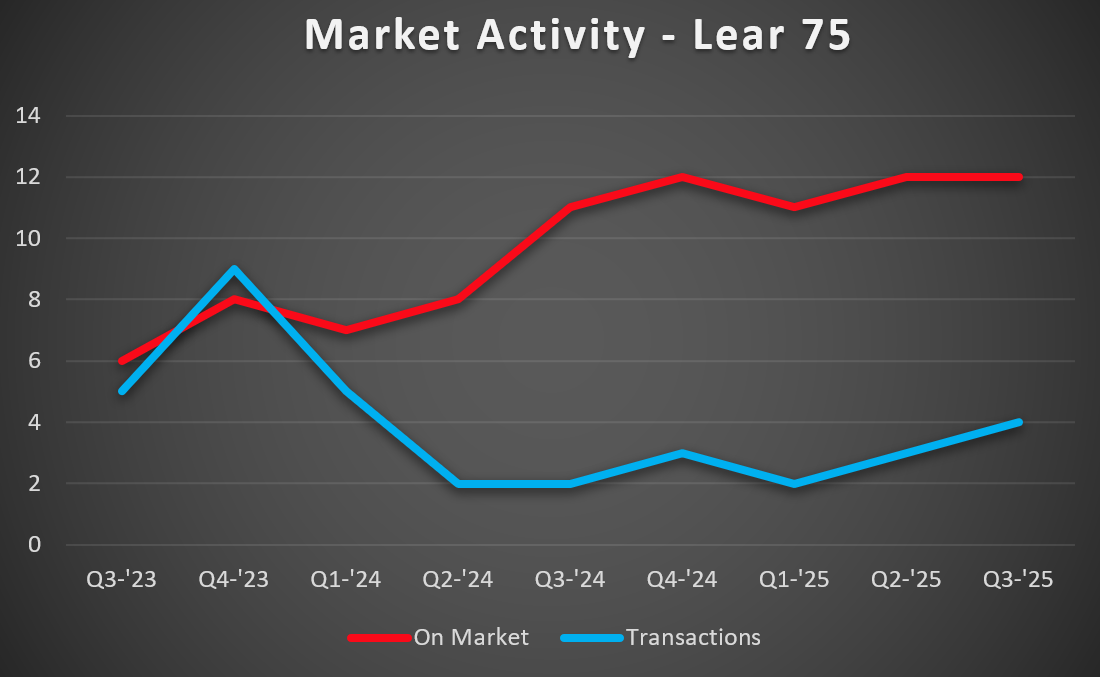 Lear 75 inventory remains stable, and transactions continue to take place. There are 12 listings in this market, similar to last quarter and quite frankly the prior year. After jumping from eight to eleven listings during Q3 of 2024, inventory has consistently remained between 8-9% of the active fleet. Four sales took place during the third quarter, which is the most activity we’ve seen in this market since Q1 of 2024. Pricing remains stable, especially for early models, whereas some of the better deals seem to be in the later model years. With steady inventory and pricing, this market is beneficial for both buyers and sellers.