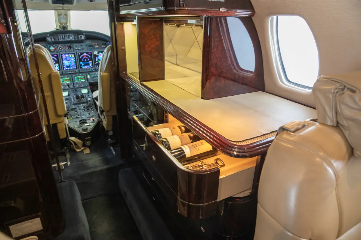 Double club seating with a belted lavatory seat. Left-hand forward closet, right-hand galley, four executive tables, and dual navigation chart cases. The aft lavatory has a vanity cabinet with sink, externally serviceable flushing toilet. Galley includes microwave oven and two hot liquid containers. Cockpit and cabin seats, carpet, cockpit lower sidewalls were redone in 2013.
