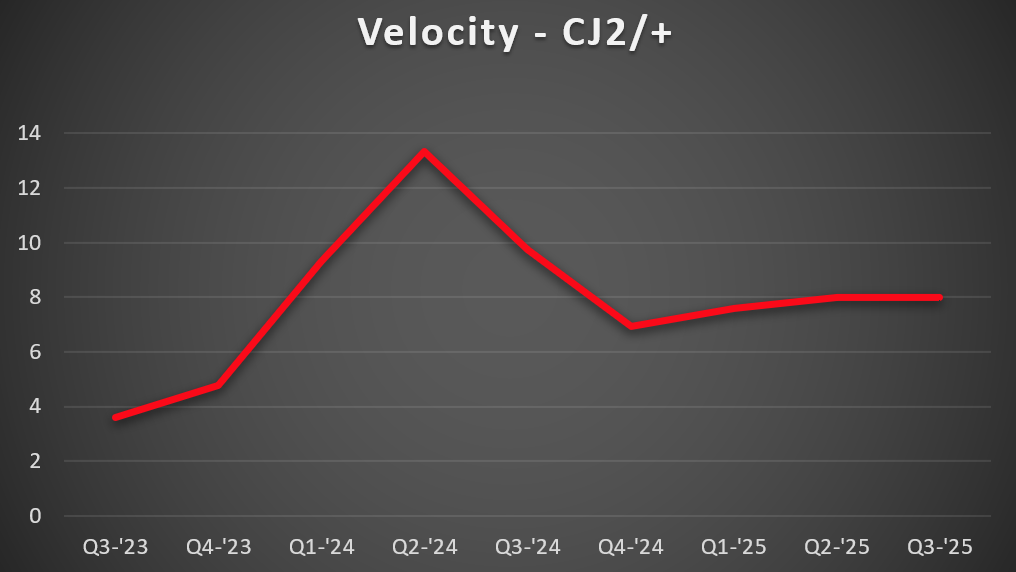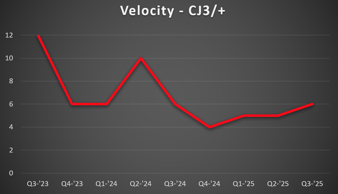 The CJ3 market saw another notable increase in inventory during Q3 2025. Unlike the surge earlier in the year, this round of new listings was not quickly absorbed, leading to a slower market velocity. Despite this, values remained stable from Q2 to Q3, and buyer interest continues to show resilience. Overall, the CJ3 market appears to be balanced but gradually shifting toward a buyer’s market, as growing inventory is beginning to outpace demand, even though underlying buying pressure remains steady.