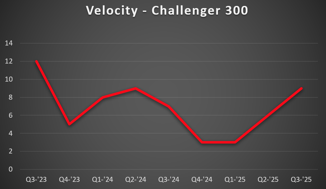 Like the 300s, Challenger 350 inventory has risen for the first time in more than a year, but strong pricing continues to impress. There are now nine listings in this market, up from just six the previous quarter. Even with the rise in inventory, there is still just 2.1% of the active fleet for sale. Activity came back to reality at just six Q3 transactions, down from an incredible 14 sales in Q2. Still, the 25 total sales for 2025 are well above previous years’ activity through the first three quarters. Prices continue to rise, with values up significantly from the start of the year. With low inventory and strong pricing, this is a great time to sell your Challenger 350.